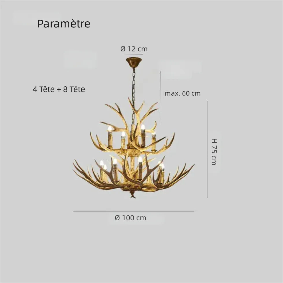 Ce lustre de style rétro, inspiré des bois de cerf, combine le métal et la résine pour une parfaite harmonie entre nature et art. la base de plafond en métal est solide, les bois en résine sont réalistes et délicats, et les abat-jours en forme de bougie avec douille E14 diffusent une lumière douce et chaleureuse. Idéal pour le salon, il révèle une élégance à la française.